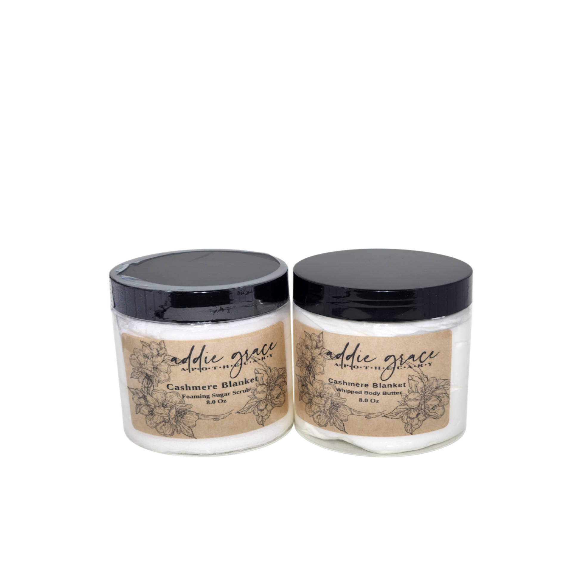 Our Cashmere Blanket Buff & Butter Bundle is your go-to for warm, comforting, skin-soothing luxury. Featuring a soft, exfoliating sugar scrub paired with a rich whipped body butter, this bundle is perfect for winding down or starting the day with calm, cozy energy.